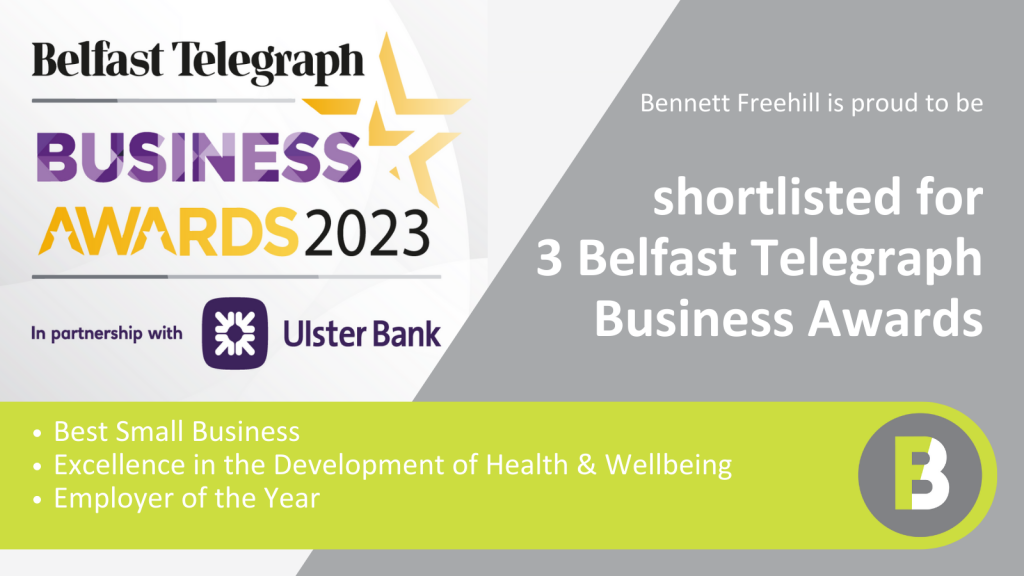 The finalists in the 2023 Belfast Telegraph Business Awards, in partnership with Ulster Bank, have been announced and the Bennett Freehill team is delighted to be shortlisted in 3 categories: Best Small Business: ‘Seeks to acknowledge an outstanding small company’ Excellence in the Development of Health & Wellbeing: ‘Demonstrates a commitment to an environment where […]