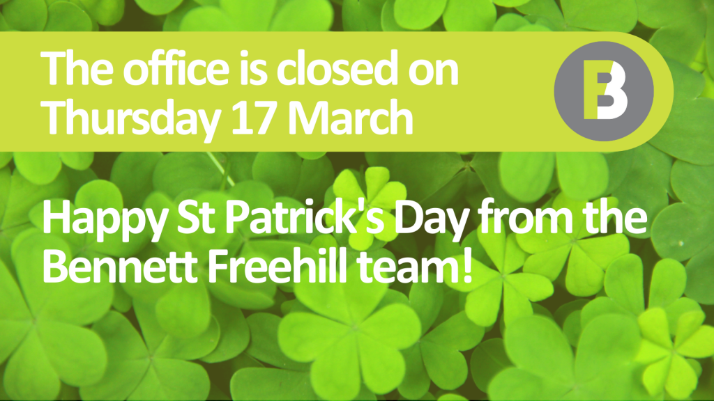 Our office will be closed on Thursday 17 March 2022 and will re-open on Friday 18 March 2022. Happy St Patrick’s Day from the Bennett Freehill team!