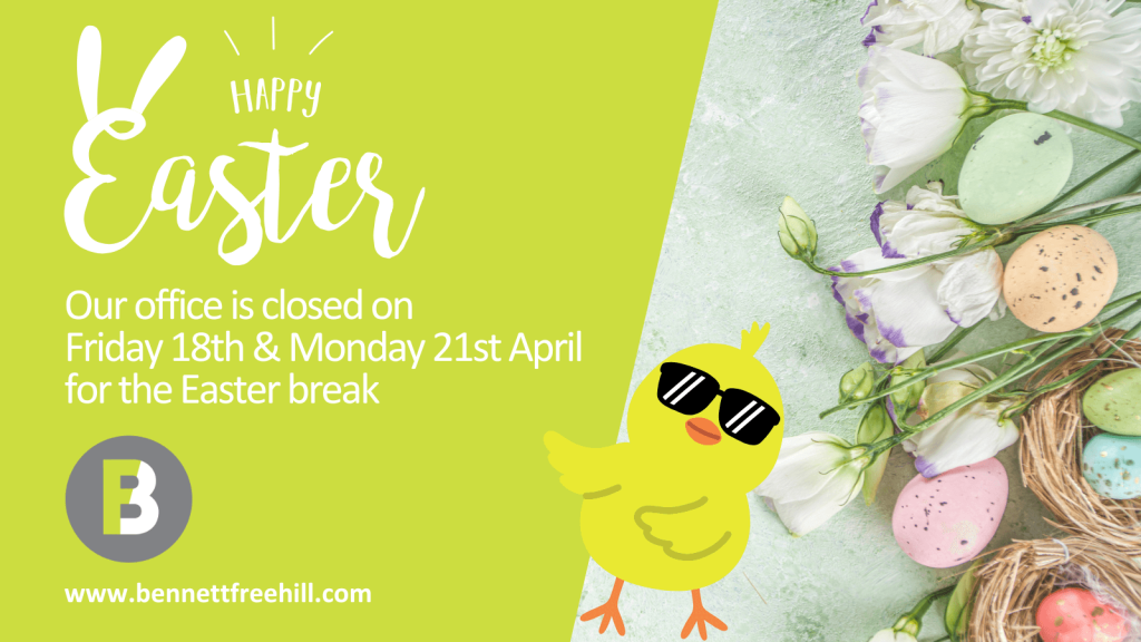 Our office is closed on Friday 18th and Monday 21st April for the Easter break. Happy Easter from all the Bennett Freehill team!
